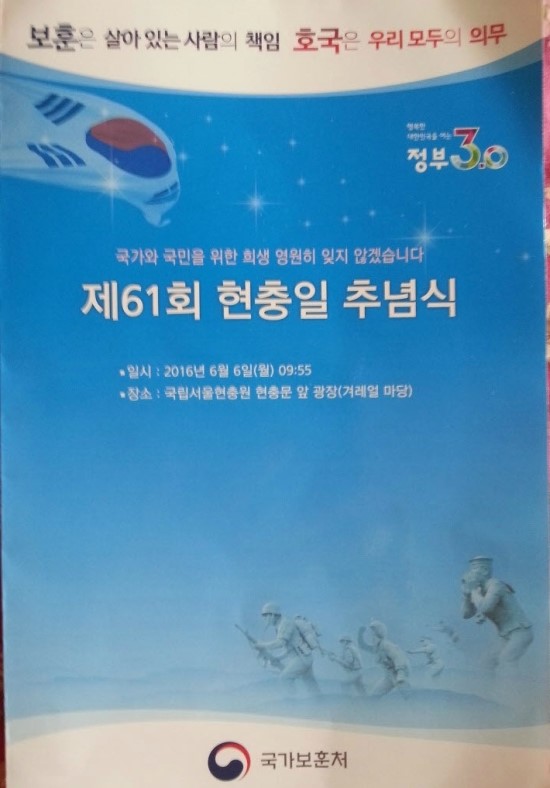 2016년 6월일 오전 9시 55분. 서울시 동작구 동작동 국립서울현충원 겨레얼 마당에서 제61회현충일 추념식이 거행되었다.