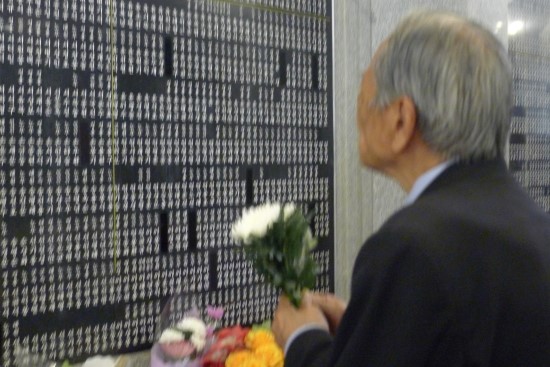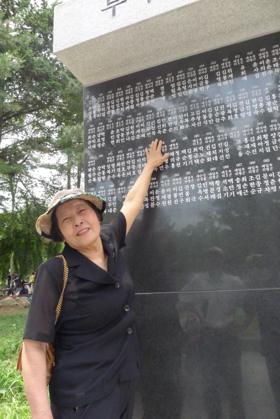 <유패봉안관에서 흰 국화를 두 손에 모아들고 이름을 찾고 있다.>