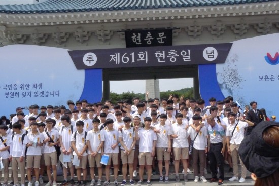 <추념식에 참석한 고등학생들이 기념 촬영을 하고 있다.>