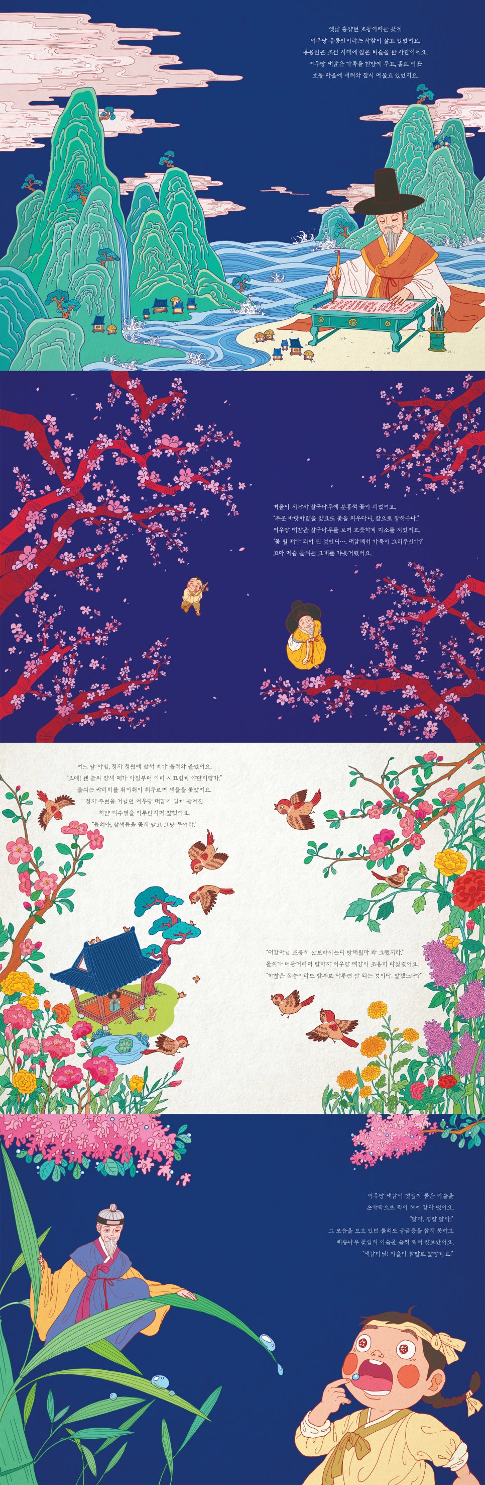 와우산과 도봉산, 금강산 일대를 떠돌던 유몽인은 본관인 전라남도 고흥으로 내려가 1년 6개월가량을 머무르게 되는데, 《단물이 내리는 정자》는 유몽인이 고흥에 머물렀던 이 시기를 배경으로 하는 이야기입니다. 어우당 대감은 자신이 머무르던 곳에 아름다운 정원을 가꾸고 그곳에 어울리는 고즈넉한 정자 한 채를 짓고는, 마을의 어른 아이 할 것 없이 누구나 와서 쉬다 갈 수 있도록 했습니다. 사람들은 성격이 온화하고 너그러운 대감을 모두 존경하고 좋아했지요. 아침 일찍 일어나 정자 주변의 정원을 산책하고, 마을 아이들이 정원에서 노는 모습을 흐뭇하게 바라보는 일이 어우당 대감의 소소한 기쁨이었습니다. 어우당 대감은 사람들과 이야기를 나누기를 즐겨 해서, 마을 사람들에게서 온갖 신기하고 재미있는 야담들을 많이 들었고 그 이야기들을 밤새 글로 지어 남겼습니다. 오늘날까지 야담 문학의 효시로 민중의 애환을 담은 설화 문학으로 널리 알려진 《어우야담》은 그렇게 탄생한 작품이었습니다.